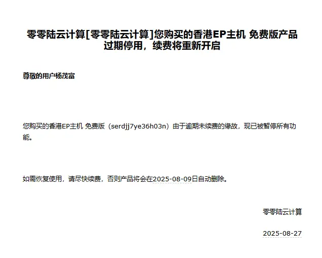 个人博客一直放在一个小作坊的免费空间,号称公益产品,永久免费,没有任何套路,用着速度还可以,半信半疑用了刚3个月,不靠谱的事情发生了,在2025年8月9日,突然给我发一封时间戳为2025年8月27日。也就是说,按照邮件所述,我网站和服务应该在月初9日就删除了,但是在截止8月27日,我网站还正常运行,我以为是看错了,特别去找网站主问了下,说让我续费,才给我开通,妥妥大流氓啊,说好的是免费的毫无征兆,直接关停我服务器,数据都没来得及备份,这还了得。