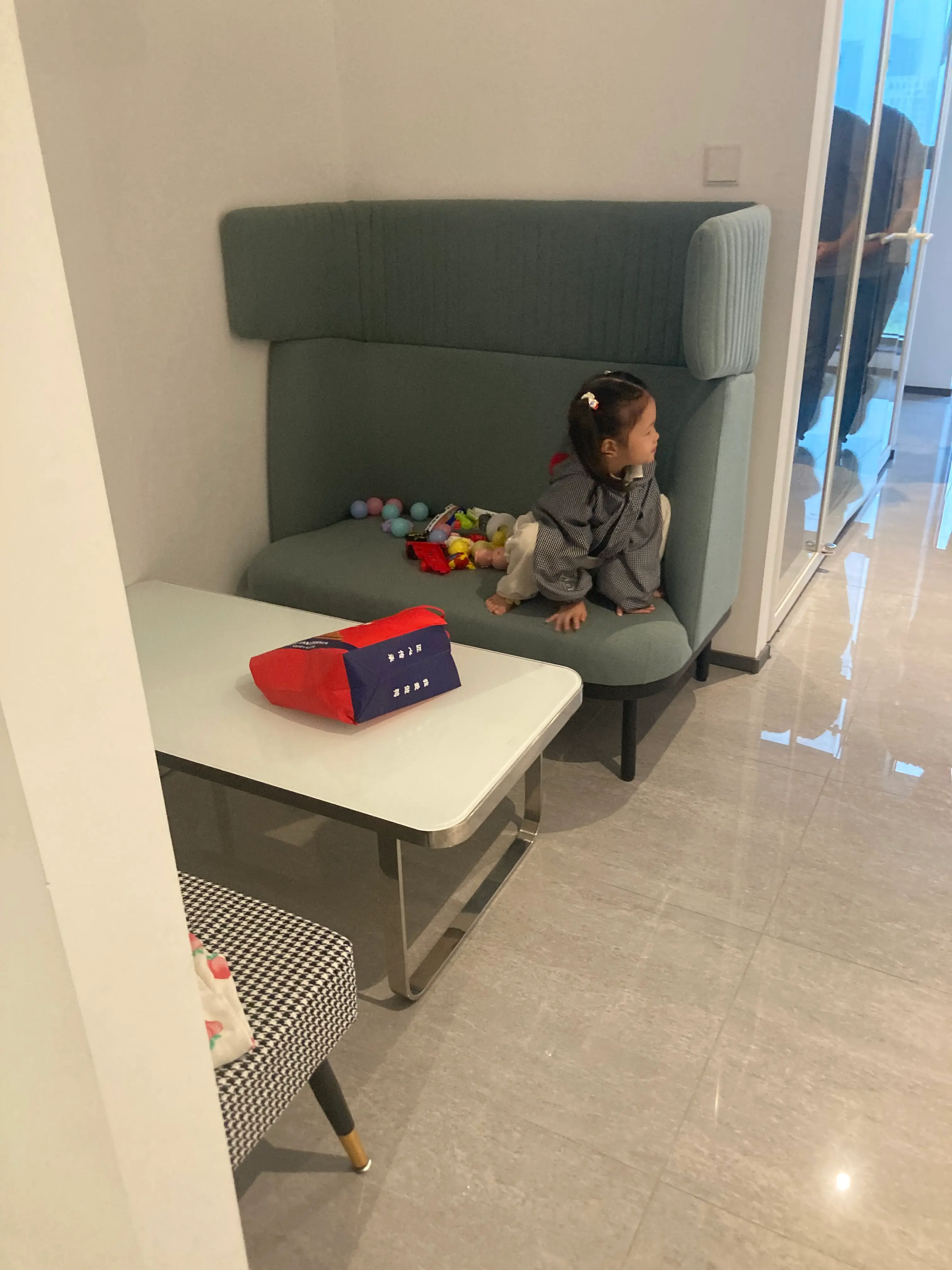 到单位后,我指着办公室门口的talk house 说,你就在这里玩,早上妈妈特别交代:“如果今天在单位听爸爸的话,不大声喧哗,不哭不闹,中午好好睡个午觉,可以奖励一杯奶茶”。可能宝贝没有听懂我的话,我前脚走,她后脚就大叫:“爸爸”,我屁股还没坐下,就被喊了起来,如此循环往复2次,为了避免影响其他同事办公,我重申早上妈妈对宝儿的承诺,安静自己玩玩具,中午好好休息一下,给你买奶茶,所以接下来,娃状态特别好,自己在sofa很专注的玩玩具,非常的出乎意料。