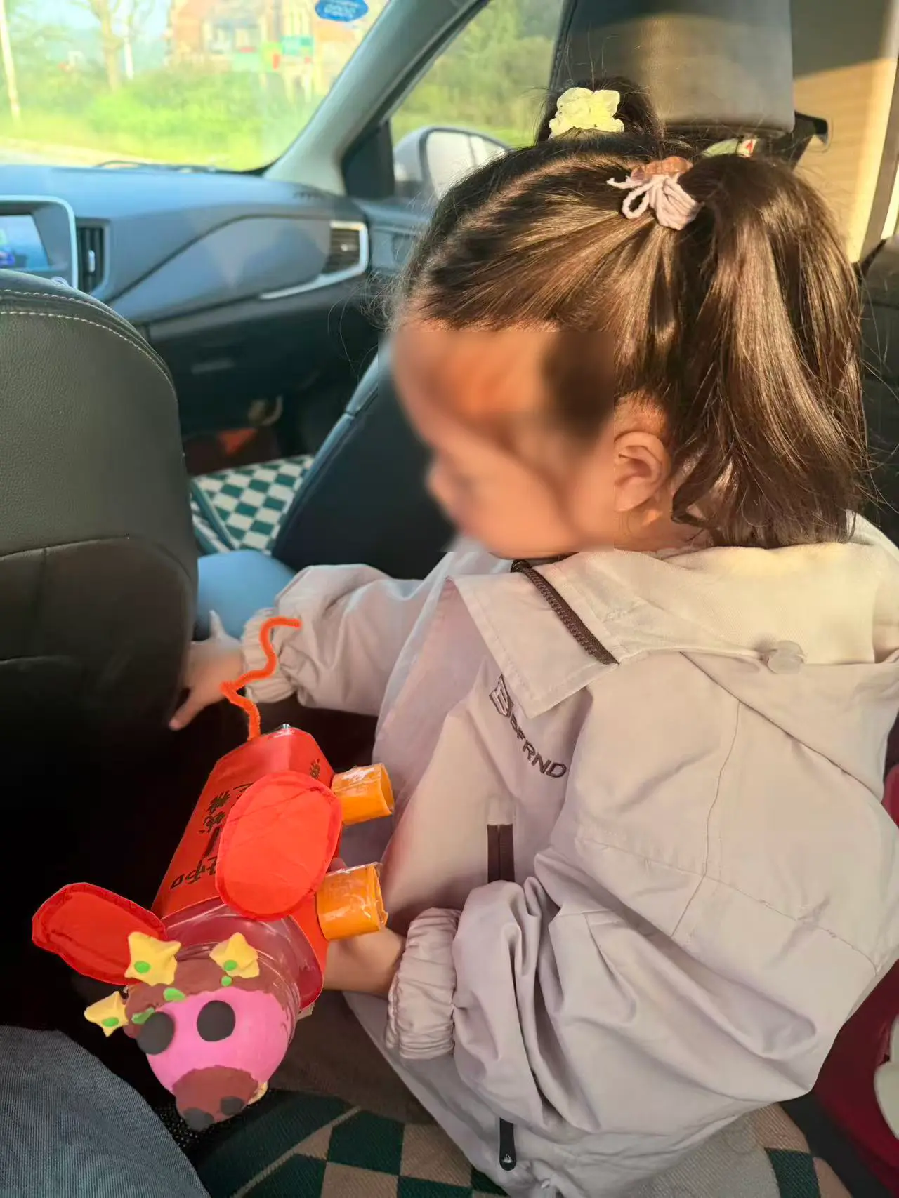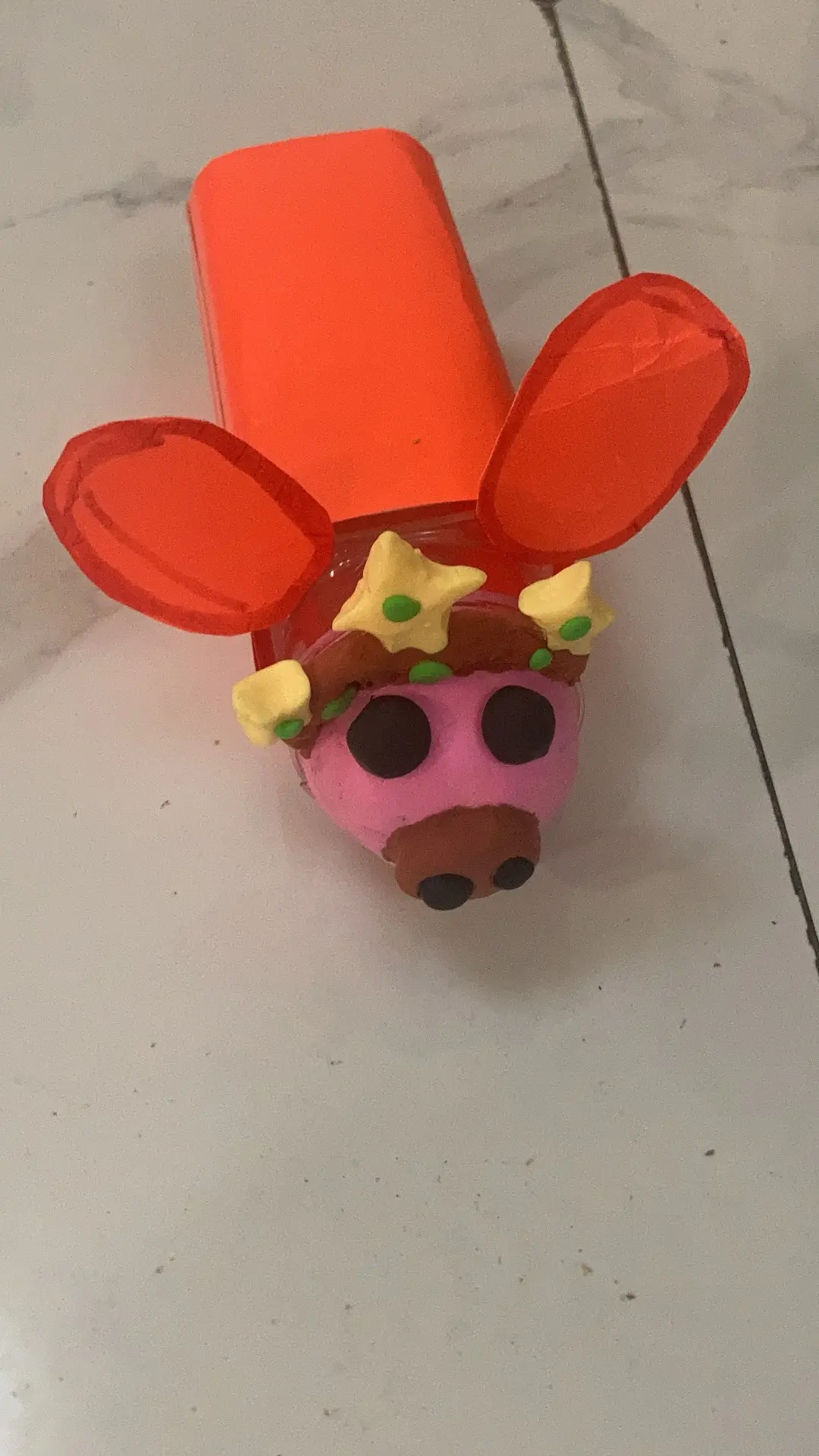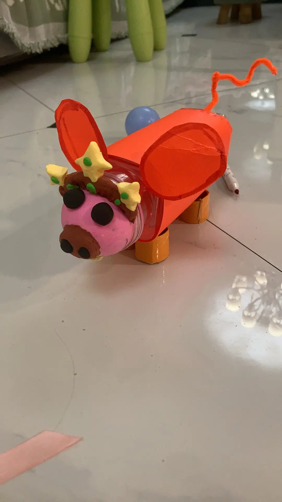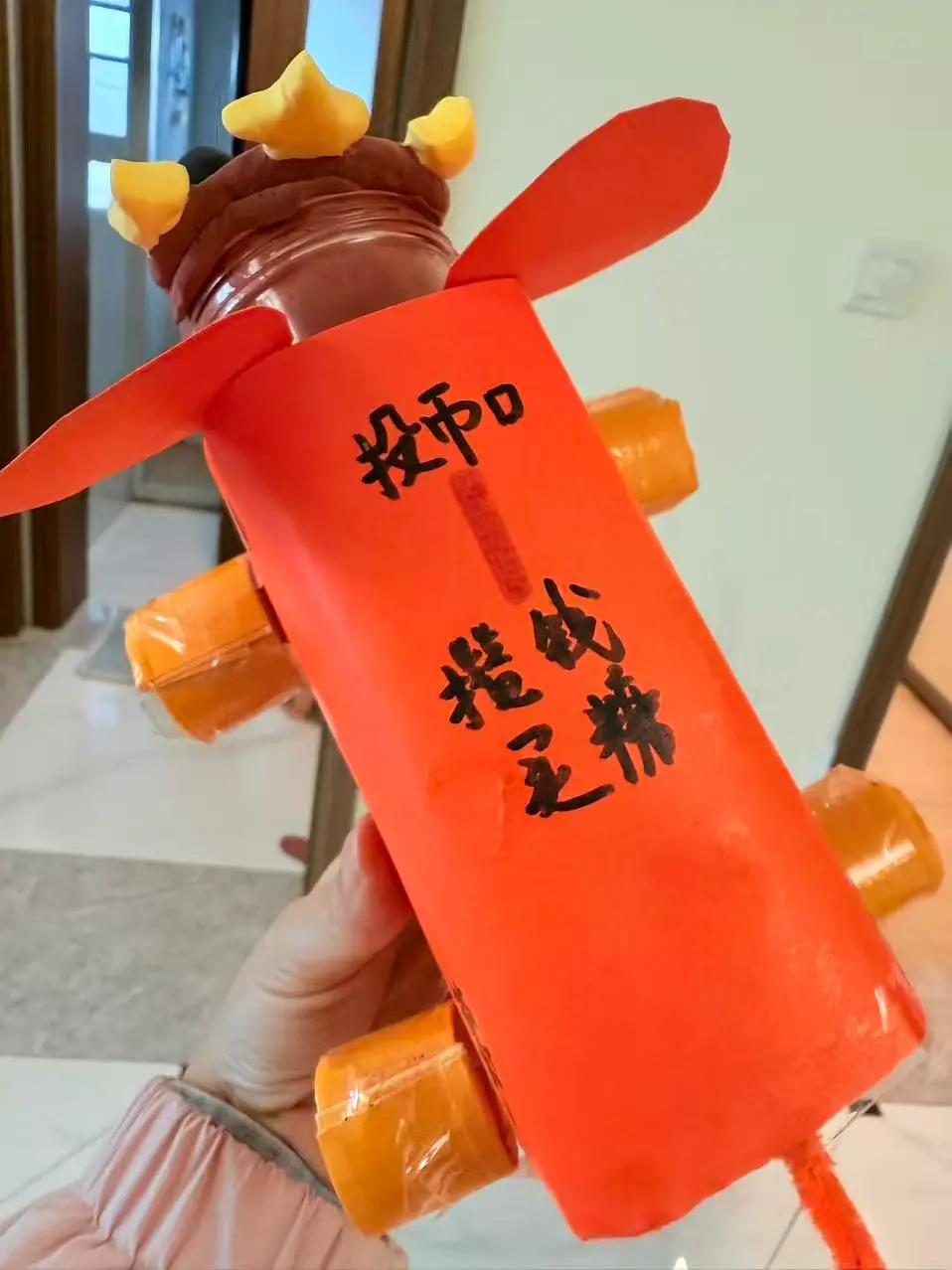 早上起来孩子看到后,娃看到后很惊奇,问这是什么,我们大家讨论,取名:飞天皇冠猪。头上三个黄色的小星星是是皇冠宝石,背部可以投币,投币口没有开启,早上我把设计释义给宝宝说明,我还告诉他,如果老师问,怎么投币呢,没有开口,我就告诉娃说:“这是设计样品,如果真的投入使用,直接开口就可以用了。”让娃拿着作品去幼儿园交稿了,哈哈。