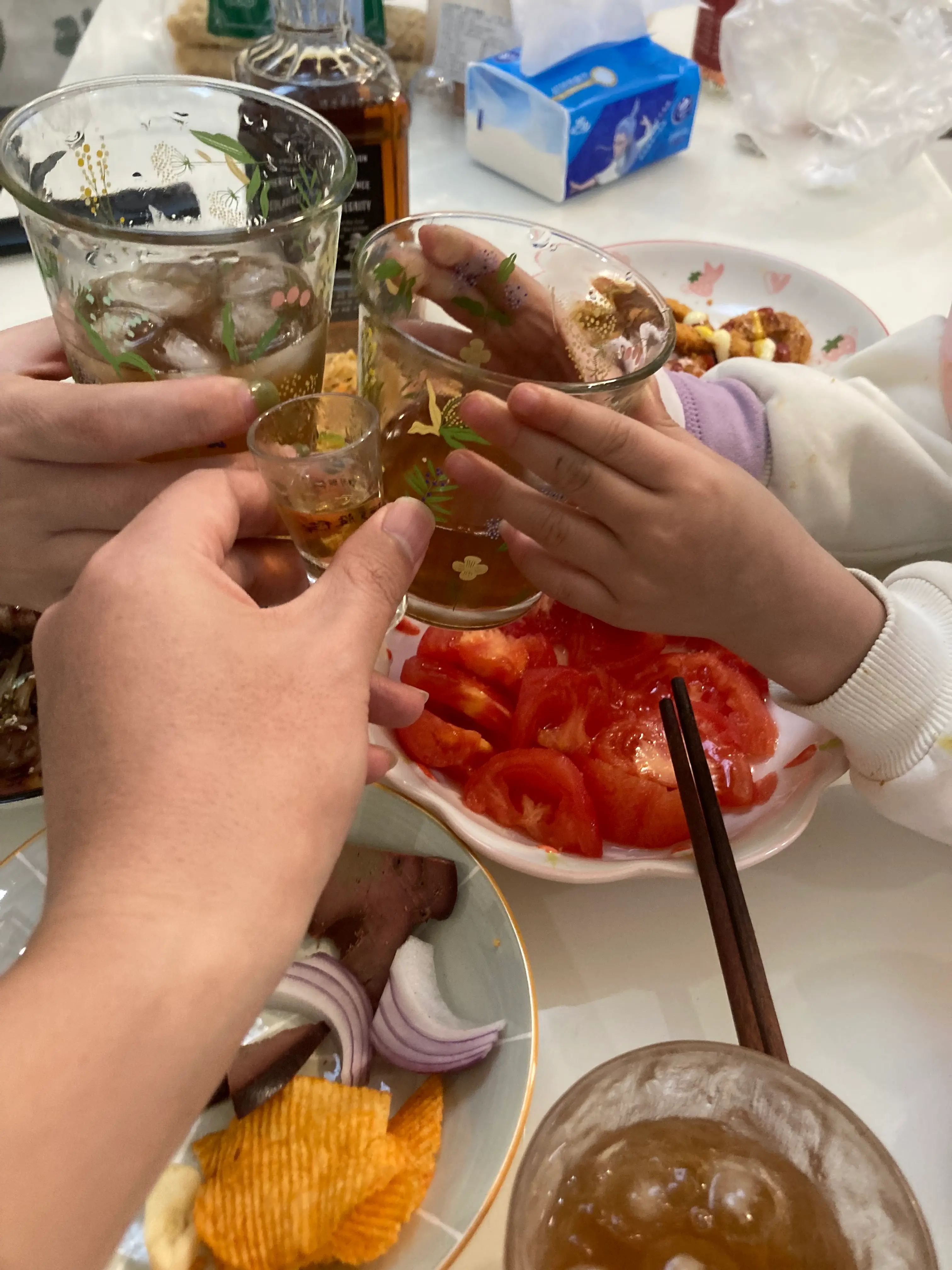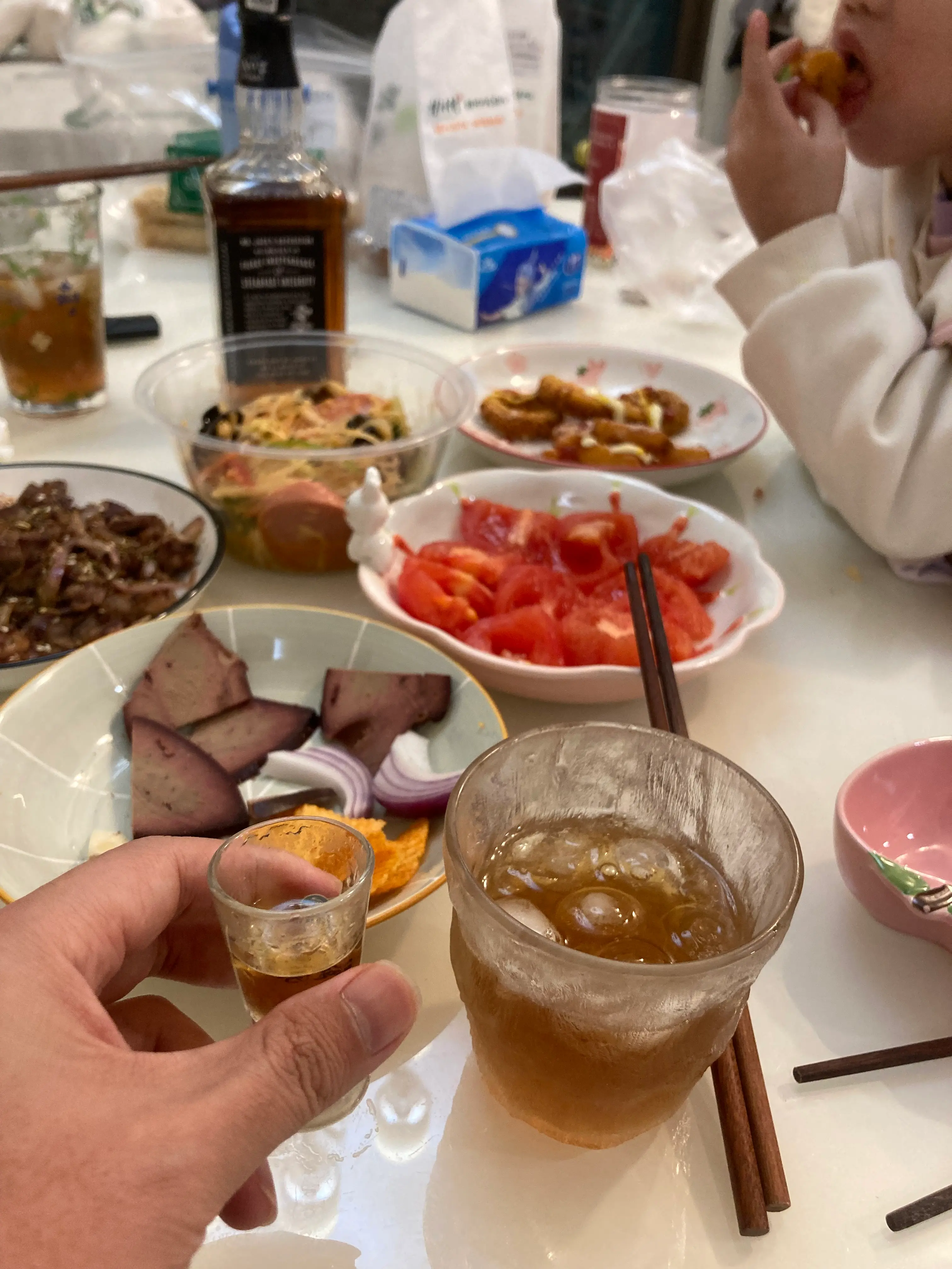 孩子也很聪慧乖巧,慢慢长大,孩子也很懂人情世故,酒桌上气氛不能少了她,嘿嘿,主动拉着我和媳妇说干杯,他们俩喝的果汁,我的小酒盅里面是40°的杰克丹尼whisky。